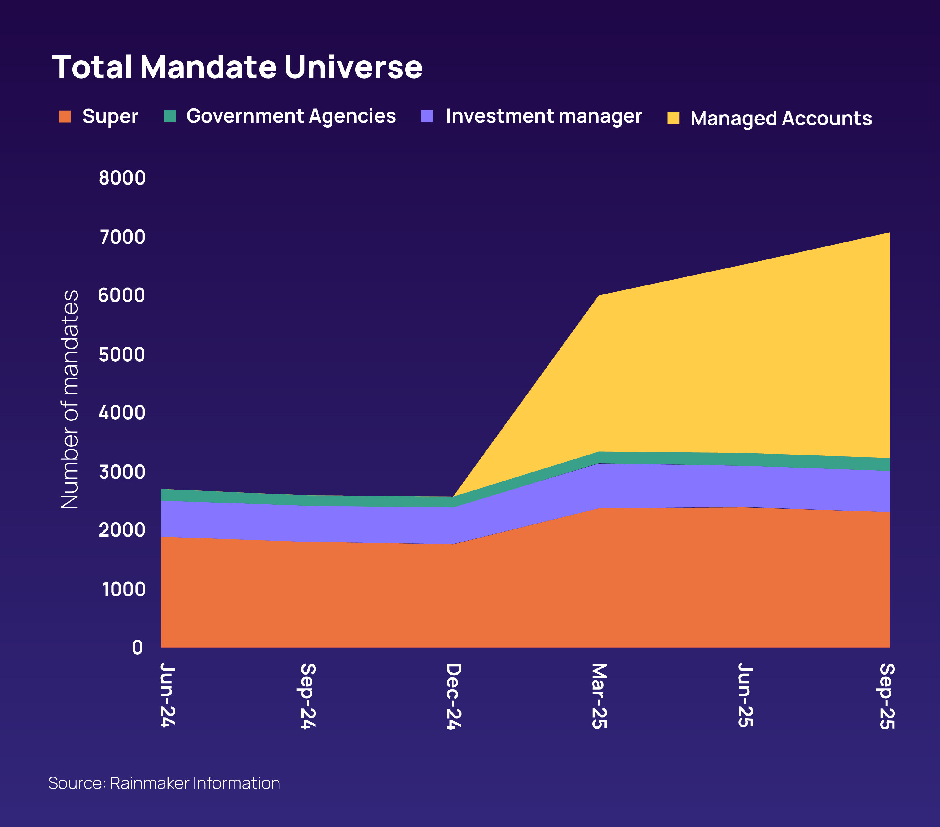 Rainmaker Information estimates there were 7,079 contestable investment mandates across the universe as at September 2025.