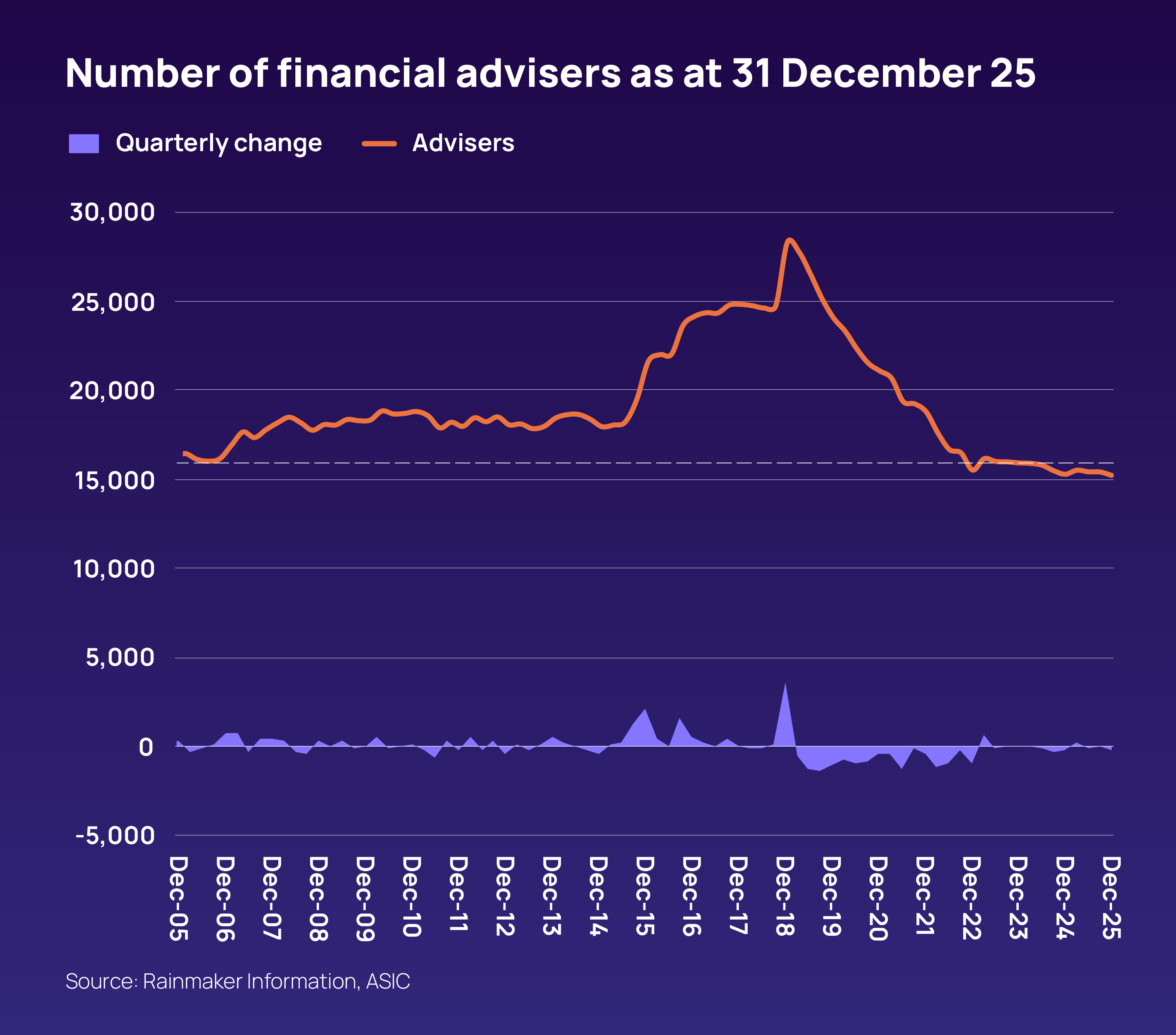 The number of ASIC-registered financial advisers went down by 0.4% through the 12 months to end December 2025 to reach 15,257.